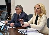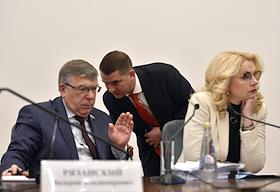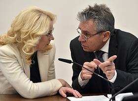 Семинар для руководителей законодательных (представительных) органов государственной власти субъектов РФ – членов Совета законодателей РФ в Российской академии наук (РАН). Заместитель председателя правительства России Татьяна Голикова (справа) и представитель в Совете Федерации России от законодательной власти Курской области Валерий Рязанский (слева) во время семинара.