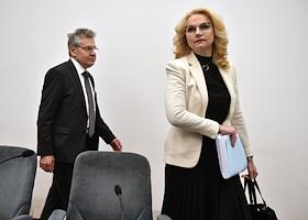 Семинар для руководителей законодательных (представительных) органов государственной власти субъектов России – членов Совета Заместитель председателя правительства России Татьяна Голикова (справа) и первый заместитель председателя Совета Федерации России Николай Федоров (слева) во время семинара.
