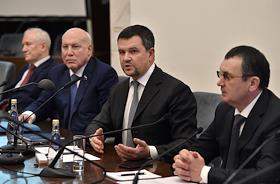 Семинар для руководителей законодательных (представительных) органов государственной власти субъектов России – членов Совета законодателей России в Российской академии наук (РАН). Справа налево: первый заместитель председателя Совета Федерации России Николай Федоров, заместитель председателя правительства России Максим Акимов и представитель от исполнительного органа государственной власти Сахалинской области Дмитрий Мезенцев во время семинара.