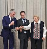Церемония открытия новой экспозиции Государственного музея спорта. Слева направо: министр спорта России Павел Колобков, министр культуры России Владимир Мединский и трехкратная олимпийская чемпионка по фехтованию Галина Горохова во время церемонии.