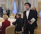 Рабочая поездка президента России Владимира Путина в Санкт-Петербург. Заседание Совета при президенте России по культуре и искусству прошло в Константиновском дворце. Пианист Денис Мацуев (слева) и художественный руководитель Государственного театра наций, актер Евгений Миронов (справа) перед началом заседания.