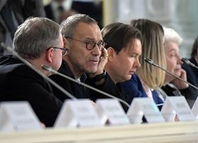 Рабочая поездка президента России Владимира Путина в Санкт-Петербург. Заседание Совета при президенте России по культуре и искусству прошло в Константиновском дворце. Слева направо: художественный руководитель Санкт-Петербургского Академического театра балета Бориса Эйфмана Борис Эйфман, временно исполняющий обязанности губернатора Санкт-Петербурга Александр Беглов и генеральный директор Московской государственной академической филармонии Алексей Шалашов перед началом заседания.