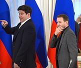 Рабочая поездка президента России Владимира Путина в Санкт-Петербург. Заседание Совета при президенте России по культуре и искусству прошло в Константиновском дворце. Композитор Игорь Крутой (справа) и председатель совета директоров Киностудии "Ленфильм", режиссер, продюсер Федор Бондарчук (слева) перед началом заседания.