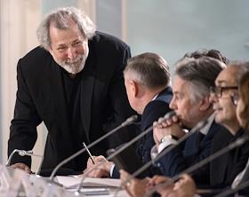 Рабочая поездка президента России Владимира Путина в Санкт-Петербург. Заседание Совета при президенте России по культуре и искусству прошло в Константиновском дворце. Слева направо: пианистка Екатерина Мечетина, художественный руководитель Государственного театра наций Евгений Миронов, ректор Санкт-Петербургского государственного академического института живописи, скульптуры и архитектуры имени И.Е.Репина Сергей Михайловский и режиссер Андрей Кончаловский перед началом заседания.