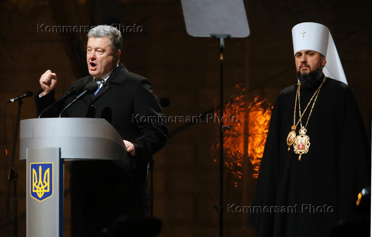 "Объединительный собор" по созданию новой поместной церкви на Украине, инициированный президентом Украины Петром Порошенко и Константинопольским патриархом Варфоломеем. Президент Украины Петр Порошенко (слева) и епископ новой Украинской православной церкви Киевского патриархата (УПЦ КП) Епифаний (справа) во время "объединительного собора".