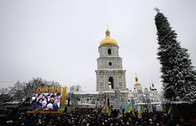 "Объединительный собор" по созданию новой поместной церкви на Украине, инициированный президентом Украины Петром Порошенко и Константинопольским патриархом Варфоломеем. Верующие на Софийской площади.