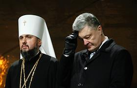 "Объединительный собор" по созданию новой поместной церкви на Украине, инициированный президентом Украины Петром Порошенко и Константинопольским патриархом Варфоломеем. Президент Украины Петр Порошенко (слева) и председатель Верховной рады Украины Андрей Парубий (справа) во время "объединительного собора".
