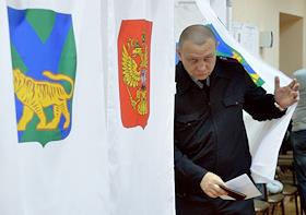 Повторные выборы губернатора Приморского края. Кандидат на должность губернатора Приморского края временно исполняющий обязанности губернатора Приморского края Олег Кожемяко после голосования на одном из избирательных участков во Владивостоке.