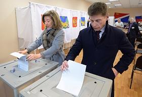 Повторные выборы губернатора Приморского края. Кандидат на должность губернатора Приморского края временно исполняющий обязанности губернатора Приморского края Олег Кожемяко с супругой Ириной Герасименко во время голосования на одном из избирательных участков во Владивостоке.