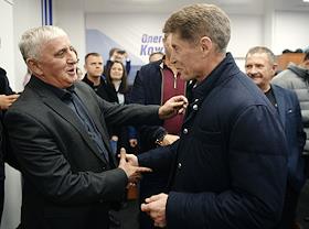Повторные выборы губернатора Приморского края. Кандидат на должность губернатора Приморского края временно исполняющий обязанности губернатора Приморского края Олег Кожемяко (справа) в своем Общественном штабе после окончания голосования.