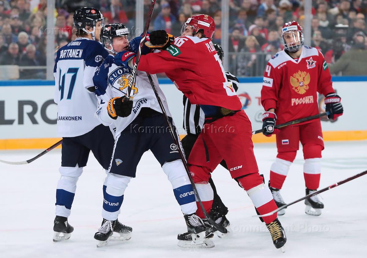 Кубок Первого канала по хоккею 2018. Матч между сборными командами России и Финляндии прошел на стадионе "Зенит Арена". Слева направо: игроки сборной Финляндии Юрки Йокипакка, Йони Ортио (вратарь), игроки сборной России Сергей Плотников и Сергей Андронов во время матча.