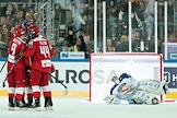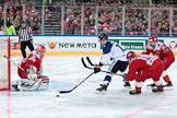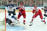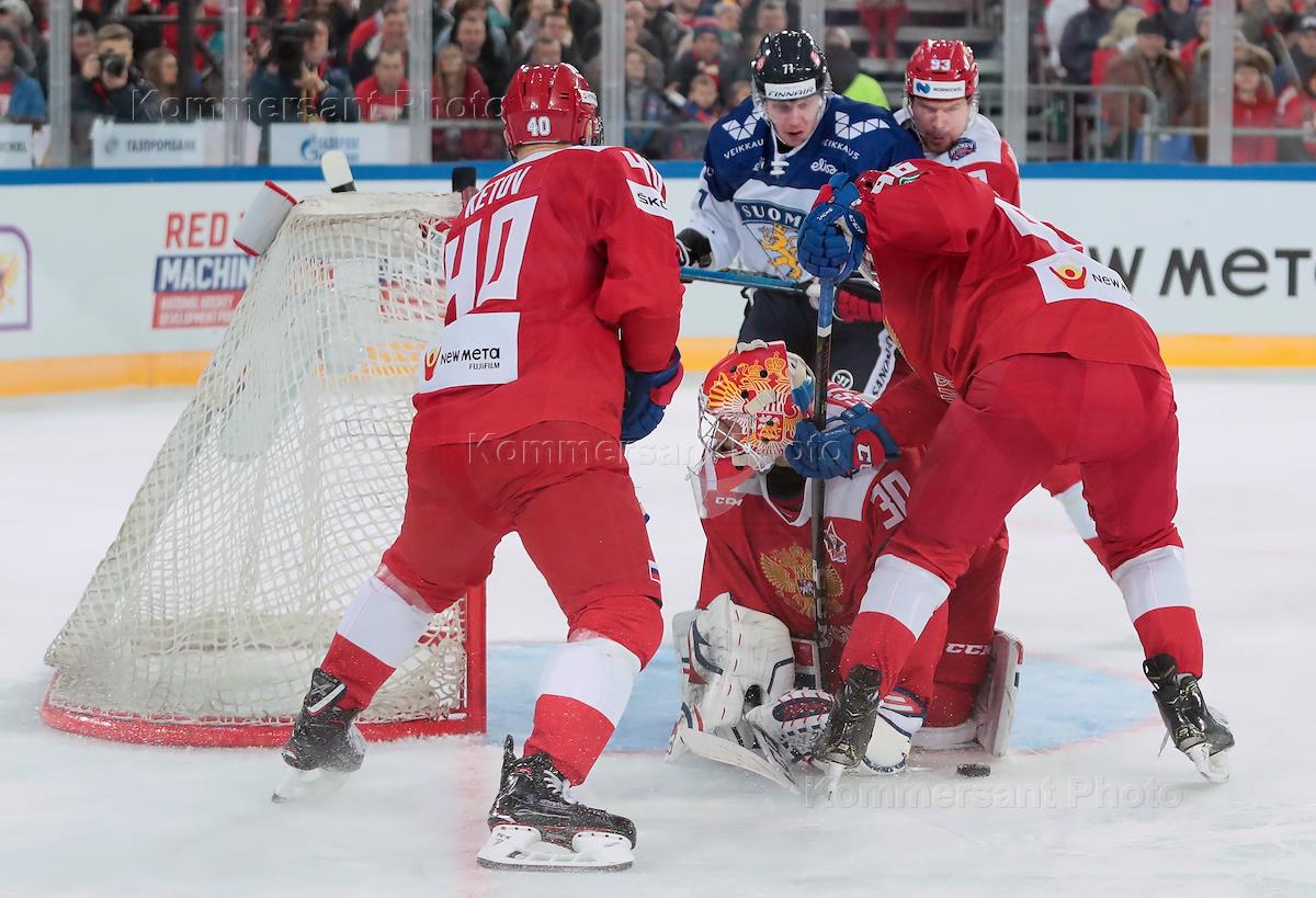 Кубок Первого канала по хоккею 2018. Матч между сборными командами России и Финляндии прошел на стадионе "Зенит Арена". Слева направо: игроки сборной Финляндии Юрки Йокипакка, Йони Ортио (вратарь), игроки сборной России Сергей Плотников и Сергей Андронов во время матча.