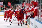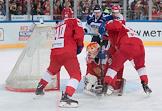 Кубок Первого канала по хоккею 2018. Матч между сборными командами России и Финляндии прошел на стадионе "Зенит Арена". Игрок сборной России Евгений Кетов (слева) и вратарь сборной России Игорь Шестёркин (в центре) во время матча.