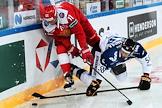 Кубок Первого канала по хоккею 2018. Матч между сборными командами России и Финляндии прошел на стадионе "Зенит Арена". Игрок сборной России Сергей Андронов (слева) и игрок сборной Финляндии Яни Хаканпяя (справа) во время матча.