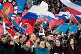 Кубок Первого канала по хоккею 2018. Матч между сборными командами России и Финляндии прошел на стадионе "Зенит Арена". Блельщики сборной России на зрительской трибуне во время матча.