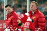 Кубок Первого канала по хоккею 2018. Матч между сборными командами России и Финляндии прошел на стадионе "Зенит Арена". Главный тренер сборной России по хоккею Илья Воробьев (слева) во время матча.