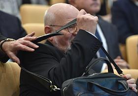 Парламентские слушания "25 лет Конституции Российской Федерации и институту Уполномоченного по правам человека в Российской Федерации: итоги и перспективы развития" в Государственной думе (ГД) России. Председатель Совета при президенте России по развитию гражданского общества и правам человека Михаил Федотов во время слушаний.