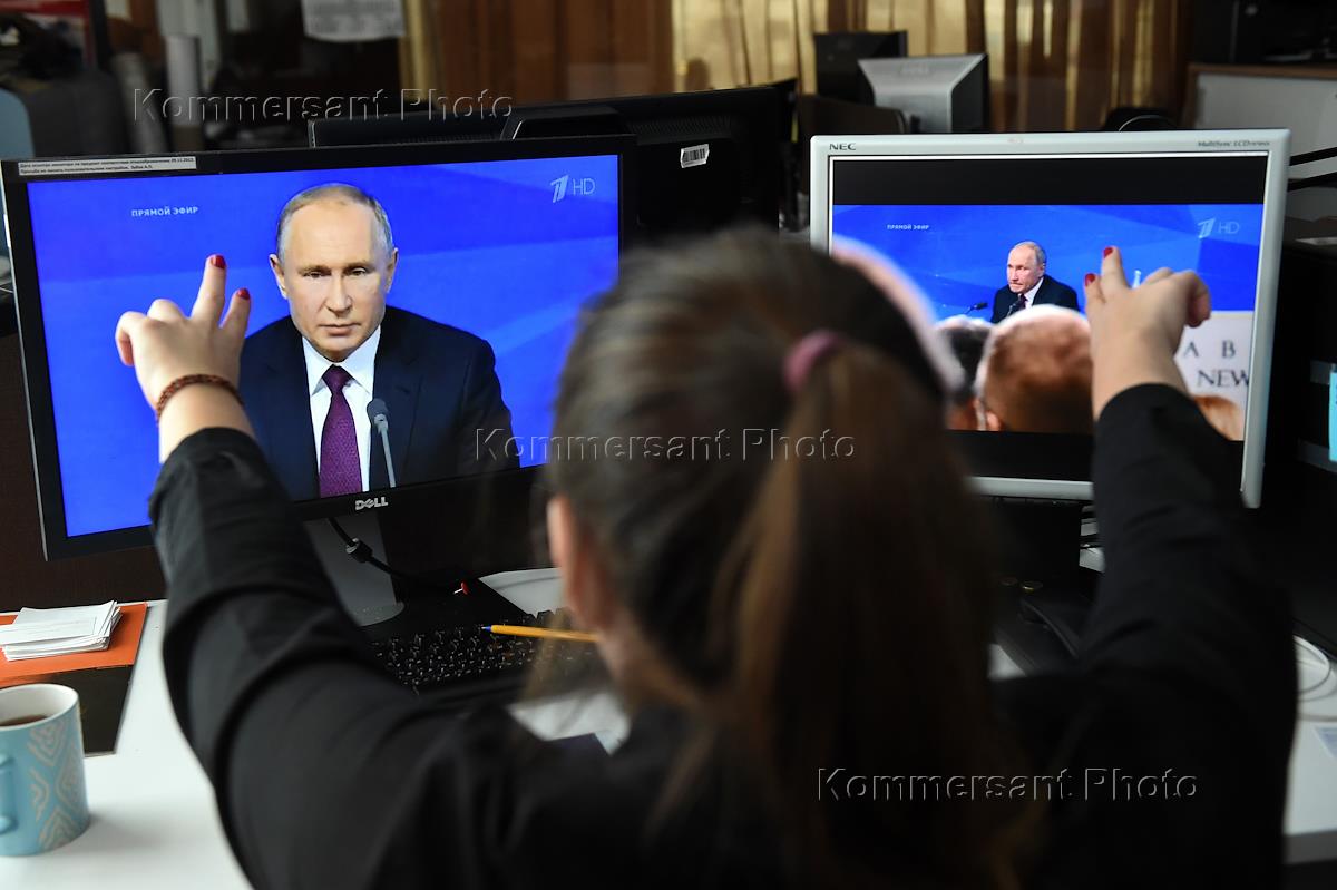 Жанровые фотографии. Трансляция ежегодной большой пресс-конференции президента России Владимира Путина.