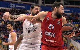 Евролига по баскетболу. Матч между командами ЦСКА (Москва, Россия) - "Анадолу Эфес" (Стамбул, Турция) прошел на стадионе "Мегаспорт". Икрок команды ЦСКА Никита Курбанов (в центре) во время матча.