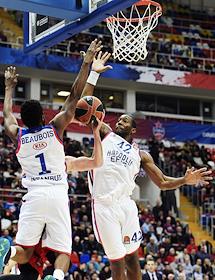 Евролига по баскетболу. Матч между командами ЦСКА (Москва, Россия) - "Анадолу Эфес" (Стамбул, Турция) на стадионе "Мегаспорт". Игроки команды "Анадолу Эфес" Родриг Бьёбуа (слева) и Брайант Данстон (справа) во время матча.