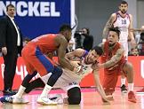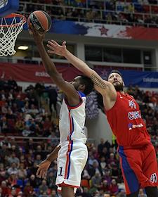 Евролига по баскетболу. Матч между командами ЦСКА (Москва, Россия) - "Анадолу Эфес" (Стамбул, Турция) на стадионе "Мегаспорт". Игрок команды "Анадолу Эфес" Адриен Морман (слева) и игрок команды ЦСКА Никита Курбанов (справа) во время матча.