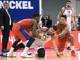 Евролига по баскетболу. Матч между командами ЦСКА (Москва, Россия) - "Анадолу Эфес" (Стамбул, Турция) на стадионе "Мегаспорт". Игрок команды "Анадолу Эфес" Василье Мичич (в центре) и игроки команды ЦСКА Кори Хиггинс (слева) и Дэниэл Хэкетт (справа) во время матча.