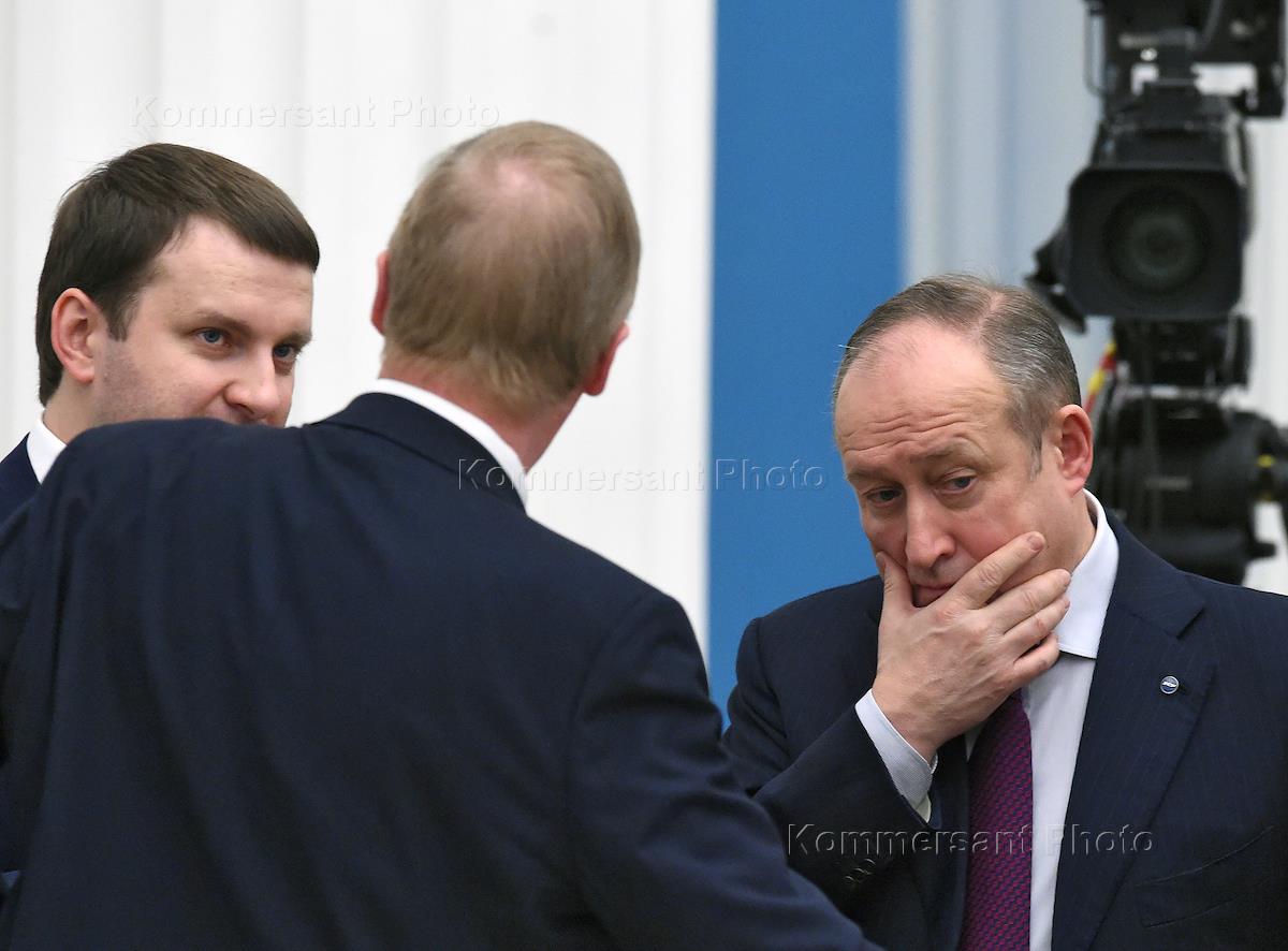 Meeting of Russian President Vladimir Putin with representatives of Russian business community in the Kremlin. Left to right: Maxim Oreshkin, Minister of Economic Development of Russia; Alexander Shokhin, Chairman of the Russian Union of Industrialists and Entrepreneurs (RSPP), and Andrei Belousov, Assistant to the President of Russia, before the meeting.