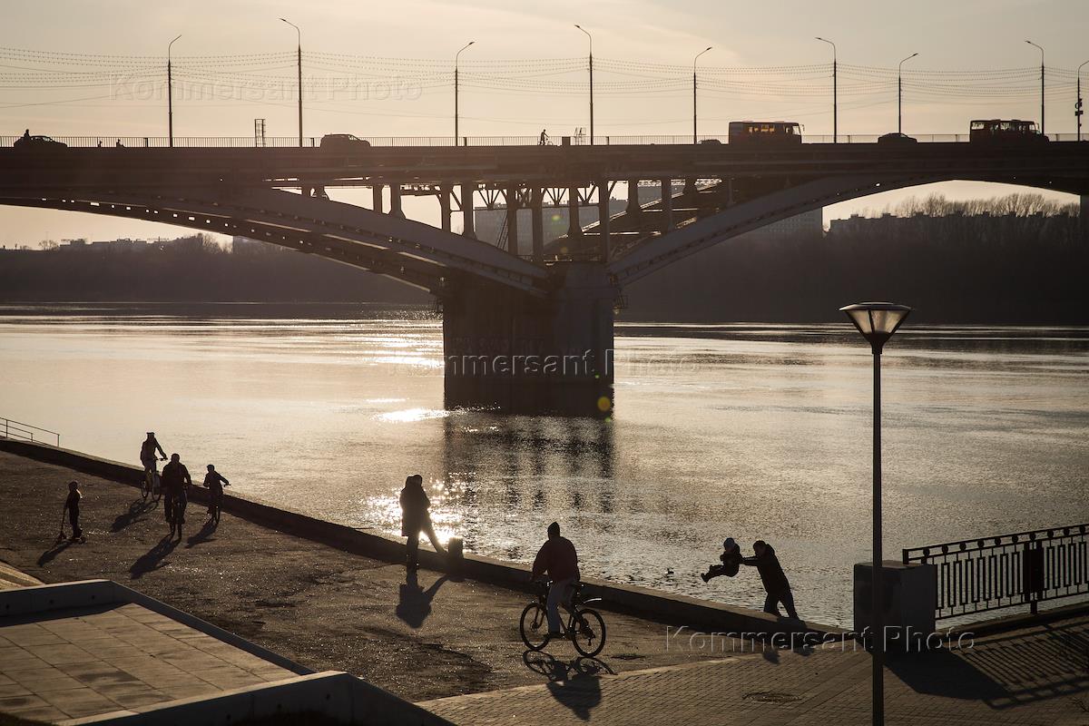 Меры по предотвращению распространения короновируса COVID-19. Жанровая фотография. Люди гуляют на набережной в первый день карантина.