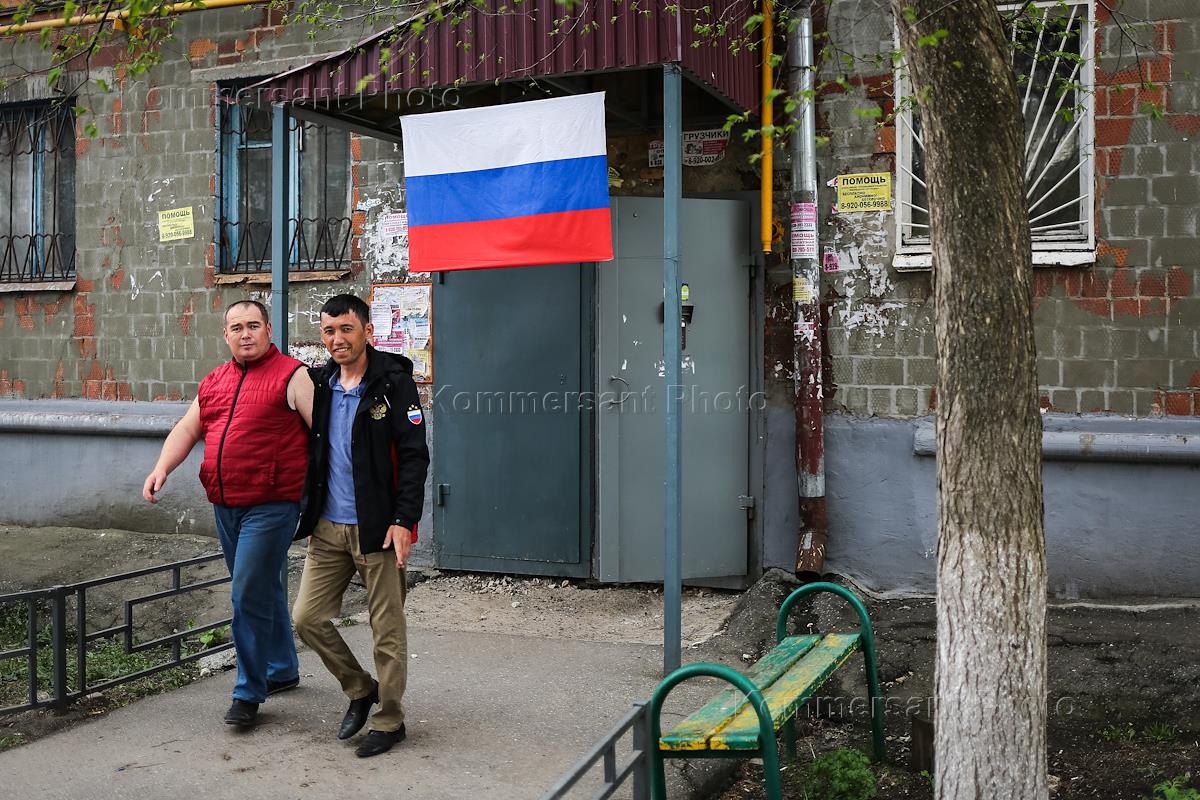 Нижний Новгород во время режима самоизоляции из-за опасности распространения коронавирусной инфекции COVID-19. Празднование 75-ой годовщины Победы в Великой Отечественной войне. Жанровая фотография. Подъезд жилого дома, украшенный флагом России ко Дню Победы.