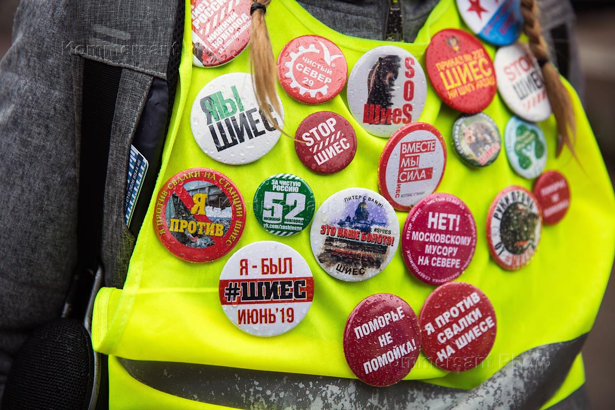 Единый день экопротеста. Акции против строительства мусорного полигона на станции Шиес в Архангельской области. Участники акции с транспорантом "Поморье на помойка".