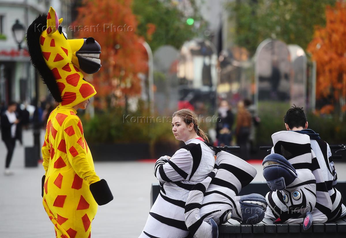 Genre photo. Young people dressed in costumes of giraffe and zebra in the street.