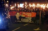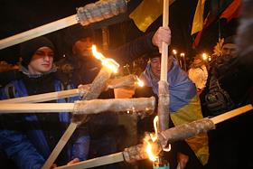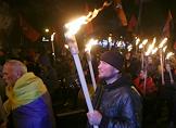 Факельный марш в честь дня рождения лидера Организации Украинских Националистов (ОУН) Степана Бандеры прошел в центре Киева. Участники несут плакат с портретом Степана Бандеры во время марша.