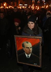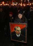 Факельный марш в честь дня рождения лидера Организации Украинских Националистов (ОУН) Степана Бандеры прошел в центре Киева. Участница с портретом Степана Бандеры во время марша.