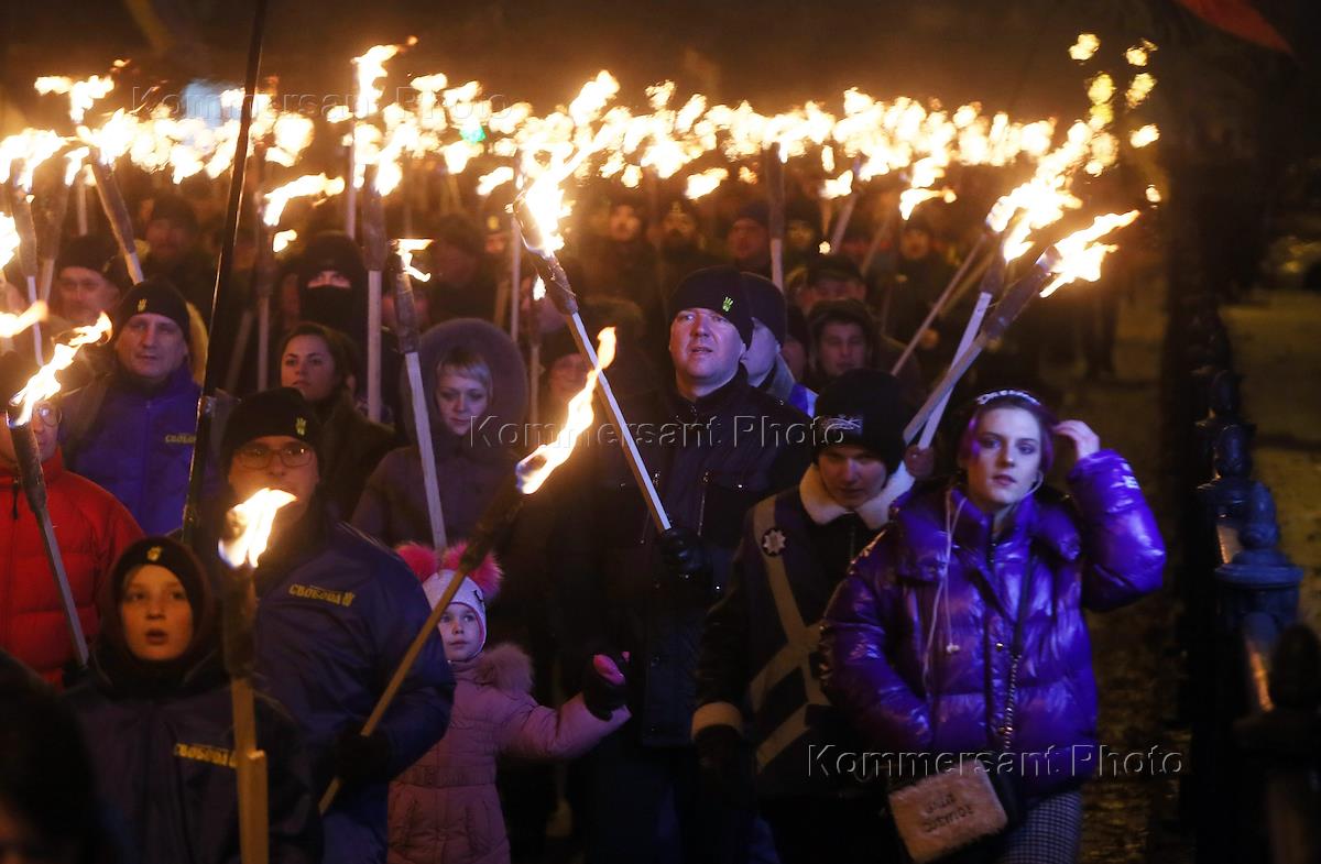 Факельный марш в честь дня рождения лидера Организации Украинских Националистов (ОУН) Степана Бандеры прошел в центре Киева. Участники несут плакат с портретом Степана Бандеры во время марша.