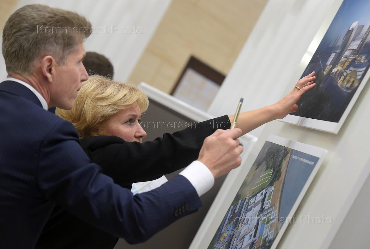Рабочая поездка президента России Владимира Путина в Калининград. Слева направо: губернатор Приморского края Олег Кожемяко, президент России Владимир Путин и заместитель председателя Правительства России Ольга Голодец перед началом совещания по вопросу создания в городах Владивостоке, Калининграде, Севастополе и Кемерово культурно-образовательных и музейных комплексов.