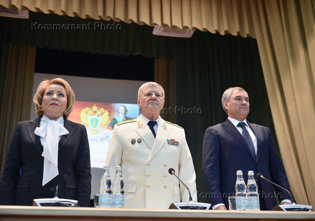 Торжественное мероприятие, посвященное 297-й годовщине образования российской прокуратуры. Слева направо: председатель Совета Федерации России Валентина Матвиенко, генеральный прокурор России Юрий Чайка и председатель Государственной думы России Вячеслав Володин во время мероприятия.
