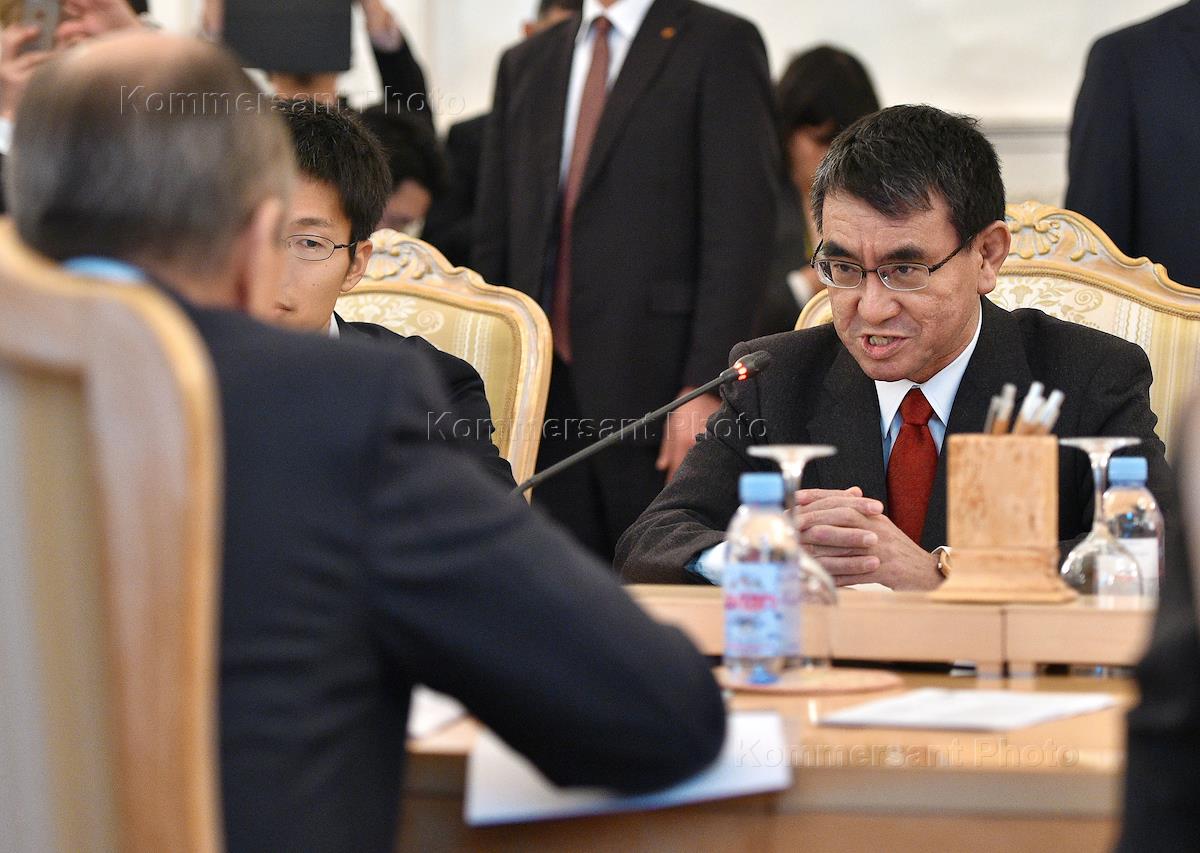 Министр иностранных дел Японии Таро Коно (справа) и министр иностранных дел России Сергей Лавров (слева) во время встречи в Доме приемов МИД России.