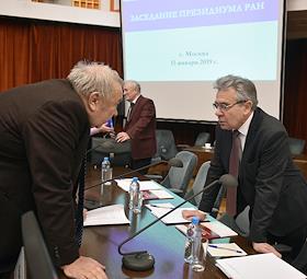 Первое в 2019 году заседание Президиума Российской академии наук (РАН). Президент РАН Александр Сергеев (справа) перед началом заседания.