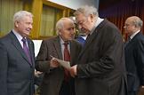 Первое в 2019 году заседание Президиума Российской академии наук (РАН). Президент РАН Александр Сергеев (слева), член президиума РАН, директор Института органического синтеза имени И.Я.Постовского Уральского отделения РАН Валерий Чарушин (справа) и член президиума РАН, академик, директор Института химии Дальневосточного отделения РАН Валентин Сергиенко (второй справа) перед началом заседания.