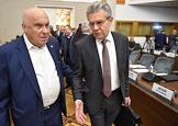 Первое в 2019 году заседание Президиума Российской академии наук (РАН). Вице-президент РАН, председатель Комиссии по работе с молодежью Валерий Козлов (в центре) и член президиума РАН, директор Института химии Дальневосточного отделения РАН, академик РАН Валентин Сергиенко (справа) перед началом заседания.