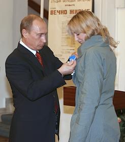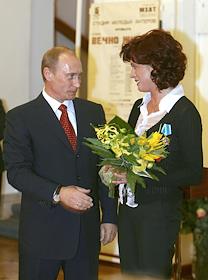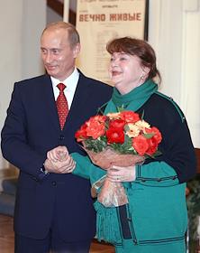 Президент России Владимир Путин (слева) и актриса Ольга Дроздова (справа) во время празднования пятидесятилетнего юбилея Театра "Современник".