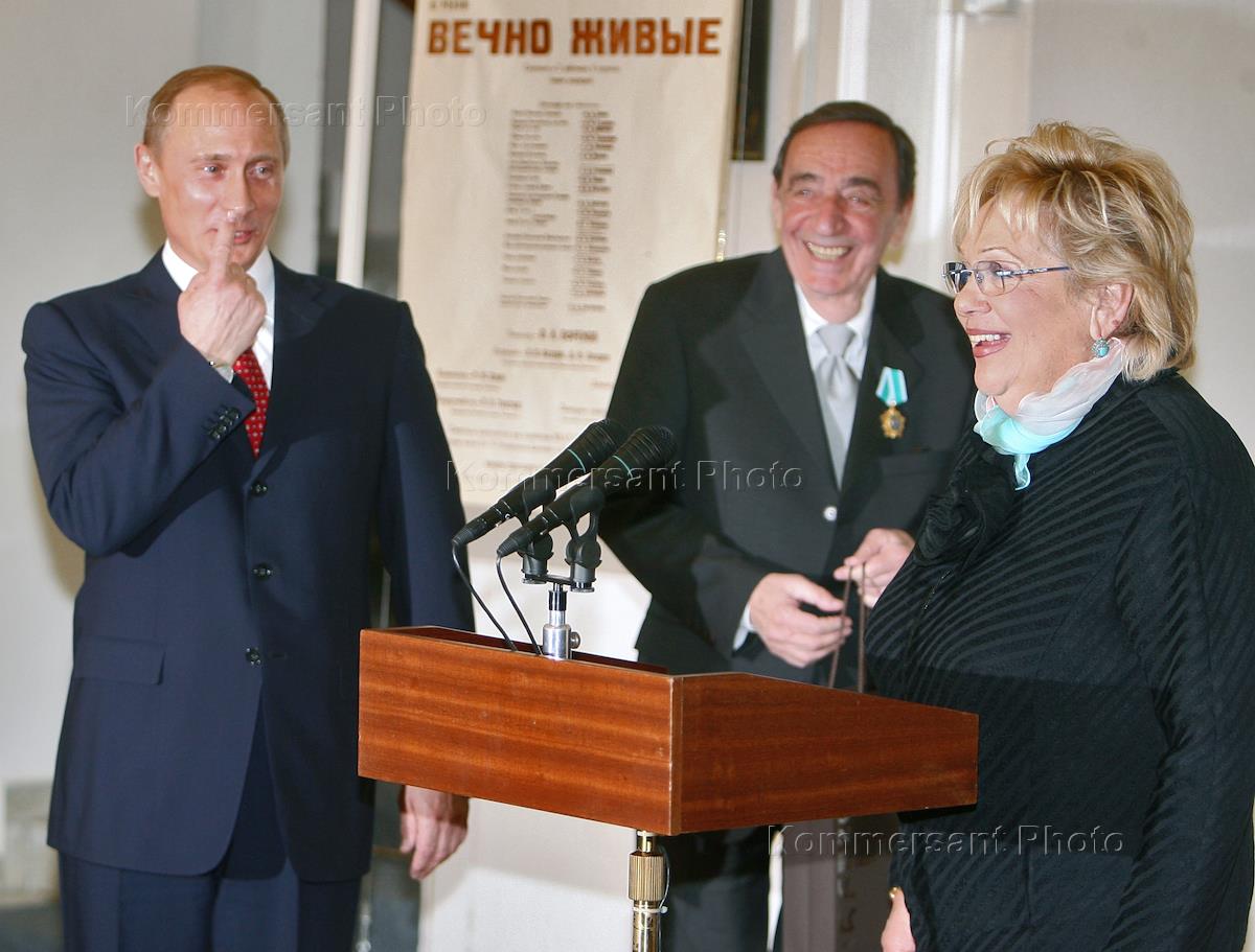 Президент России Владимир Путин (слева), директор Театра "Современник" Леонид Эрман (в центре) и художественный руководитель Театра "Современник" Галина Волчек (справа) во время празднования юбилея Театра "Современник".