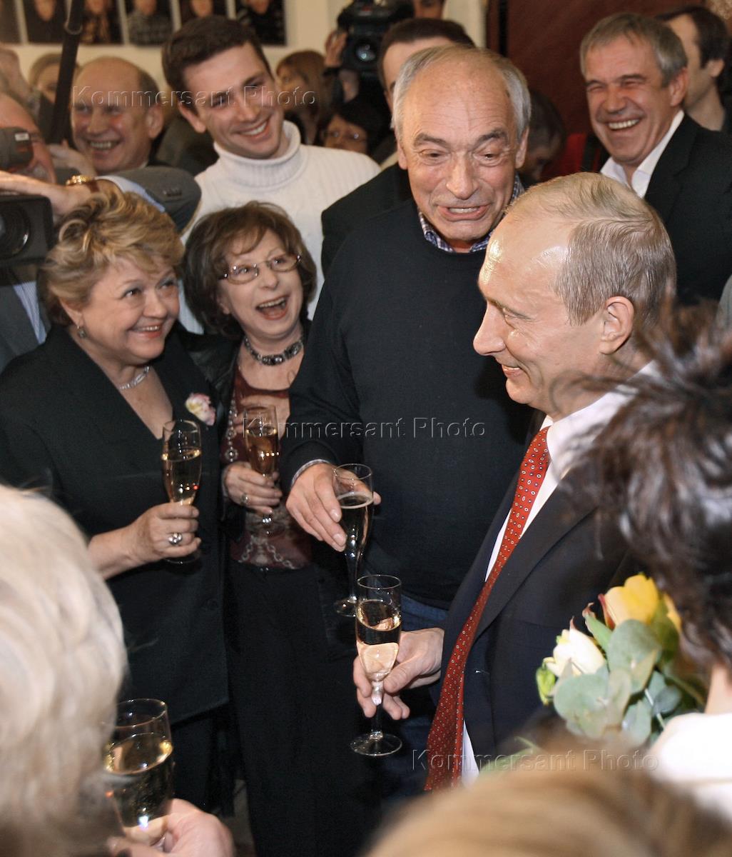 Президент России Владимир Путин (четвертый слева) с артистами Театра "Современник" Лия Ахеджакова (вторая слева), Валентин Гафт (третий слева), Сергей Гармаш (пятый слева) во время празднования юбилея Театра.