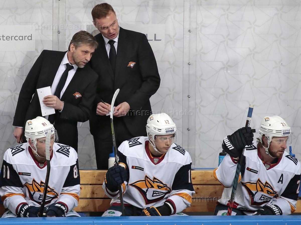 Континентальная хоккейная лига (КХЛ). Матч между командами ЦСКА (Москва) - "Металлург МГ" (Магнитогорск) на стадионе "ЦСКА Арена". Главный тренер команды "Металлург МГ" Йозеф Яндач (слева) и старший тренер команды "Металлург МГ" Виктор Козлов (справа) во время матча.