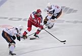 Континентальная хоккейная лига (КХЛ). Матч между командами ЦСКА (Москва) - "Металлург МГ" (Магнитогорск) на стадионе "ЦСКА Арена". Игрок команды ЦСКА Иван Телегин (в центре), игроки команды "Металлург МГ" Архип Неколенко (слева) и Евгений Тимкин (справа) во время матча.