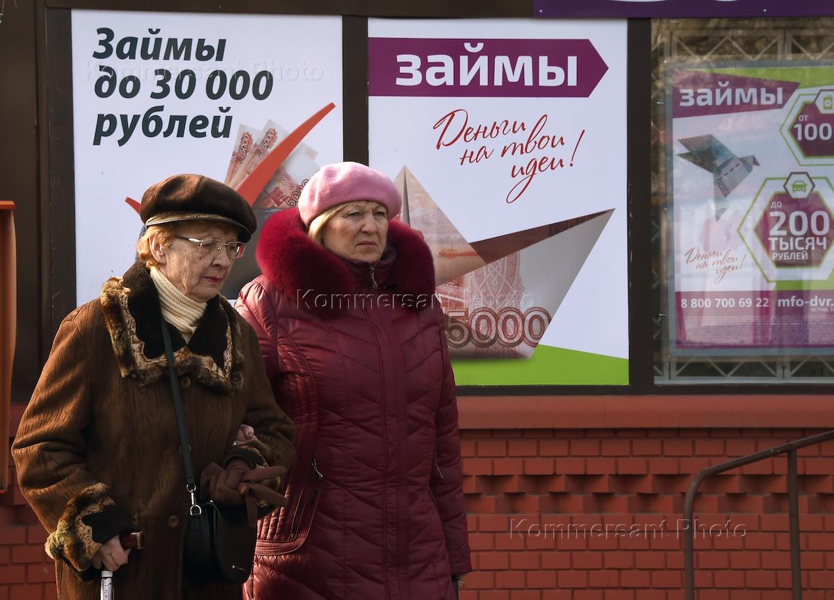 Жанровая фотография. Рекламные плакаты на тему микрофинансовых организаций. Пожилые женщины у плаката с надписью "Займы".