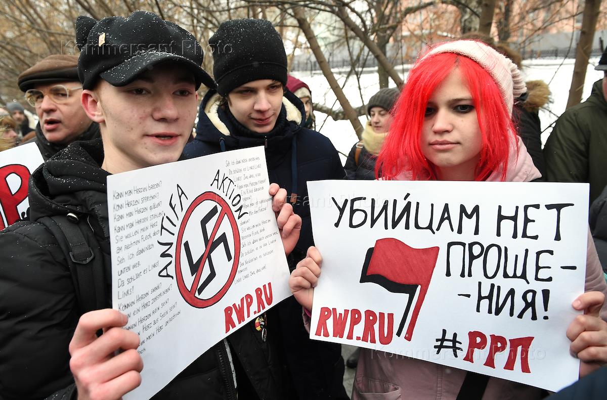 Участники ществия, организованного антифашистами, памяти адвоката Станислава Маркелова и журналистки "Новой газеты" Анастасии Бабуровой.