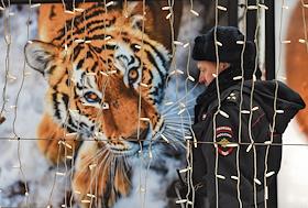 Жанровая фотография. Сотрудник полиции на фоне плаката с тигром.