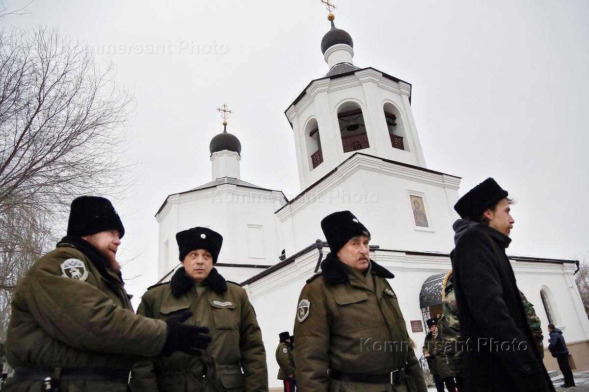 Служба и Кресный ход, посвященный 100-летию начало геноциду казачьего народа. Казаки на площади у храма.