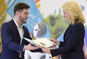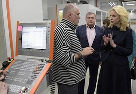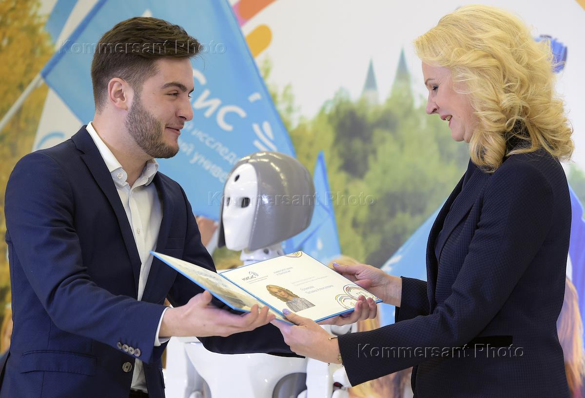 Церемония открытия Дня российского студенчества в Национальном исследовательском технологическом университете (НИТУ) "МИСиС". Заместитель председателя правительства России Татьяна Голикова (справа) и руководитель Инжинирингового центра прототипирования высокой сложности НИТУ "МИСиС" Владимир Пирожков (слева) во время церемонии.